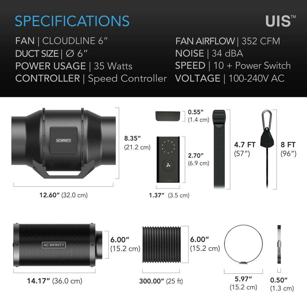 A grow tent air filtration system with all the necessary inline components you need to ventilate your grow space. By assembling these essential pieces, this package will help you quickly get your grow build started and eliminate the guesswork of purchasing them individually. This inline fan kit features the CLOUDLINE Series fan with 10-speed controller, capable of delivering powerful yet quieter performance. Paired with a carbon filter using Australian virgin charcoal to block odors from seeping out of your grow tent. These two pieces are connected by a set of flexible ducting with four layers of protection to properly direct airflow away. Accessories include duct clamps, prefilter cloth, rope clip hangers, and hanging straps to complete the installation. This product is a part of the UIS™ platform of grow devices and smart controllers, designed to integrate with each other to achieve your ideal environment.