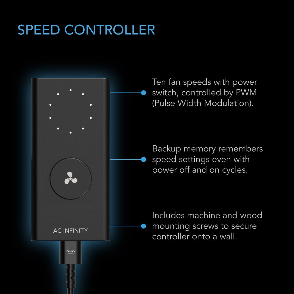 A 10-speed fan controller is paired with this inline fan to optimize airflow levels and noise in many applications. The fan’s PWM controls enable it to smoothly set fan speeds and operate at extremely low RPMs with no motor noise. Along with this wired speed controller, the CLOUDLINE is also compatible with the following controllers:
