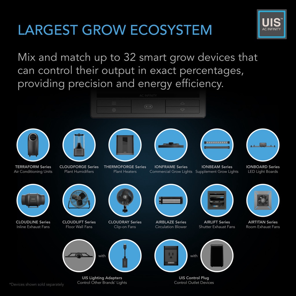 Devices in the UIS™ platform, including all AC Infinity LED grow lights and EC fans, are compatible. Compatible AC Infinity devices include those like:
