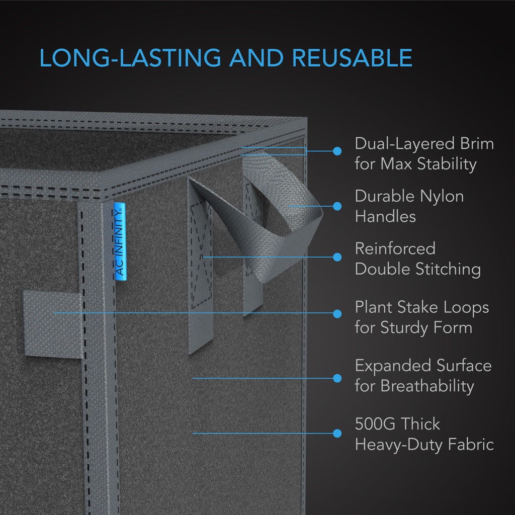 About AC Infinity Square Heavy Duty Fabric Pots 7 Gallon Aeration Reusable Grow Bags 5-Pack with 500G Thick Nonwoven Fabric and Plant Stake Loops for Garden Growing Fruits Vegetables and Flowers