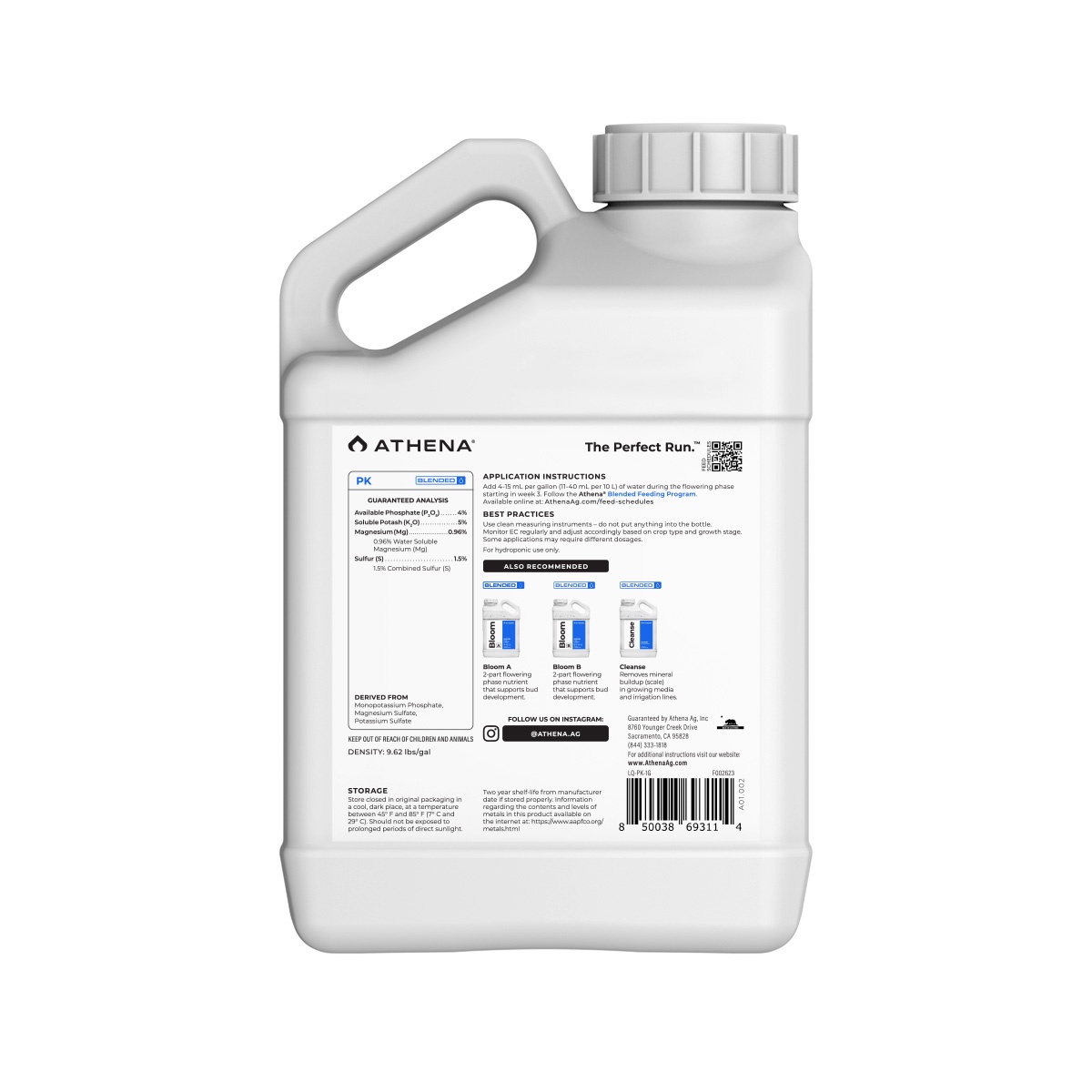 Athena PK is a bloom-boosting complement to our Bloom fertilizers. This clean liquid booster is designed to supplement during the mid- to late-flowering phase. Athena PK is a no nitrogen booster that provides additional phosphorus and potassium that high-yielding plants require for maximum production. Many PK boosters add far too much of these elements and create a cascade of problems, such as reducing calcium and magnesium availability. Balanced elemental bioavailability is essential in the flowering phase to boost essential oil and terpene production.