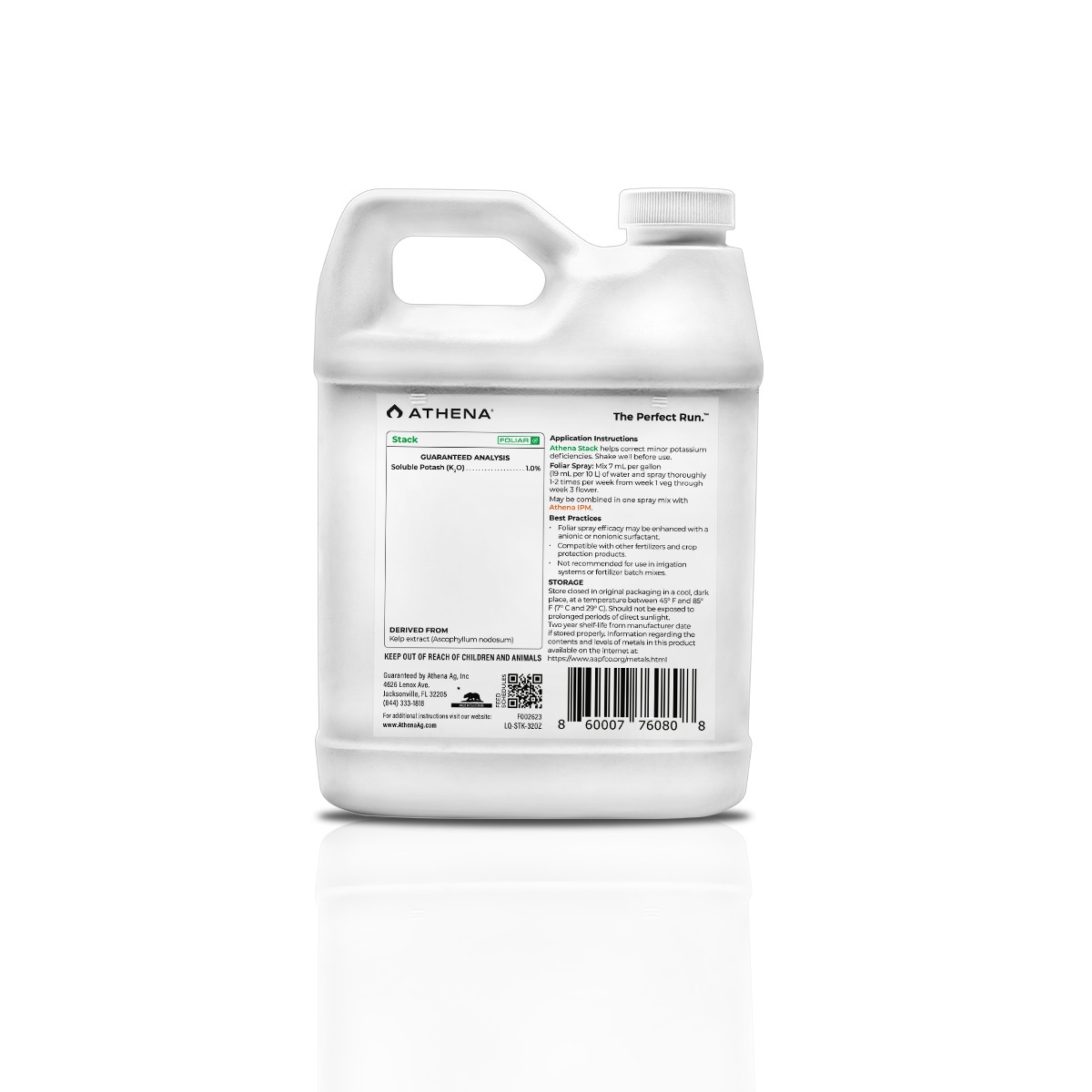Athena Stack is a natural plant nutrient made from premium kelp extract. This product supports plant growth, transition, and flowering through readily available nutrients, and provides critical building blocks to optimize conditions for better tolerance against abiotic stress. When used as a foliar or root drench, Athena Stack helps correct minor potassium deficiencies..