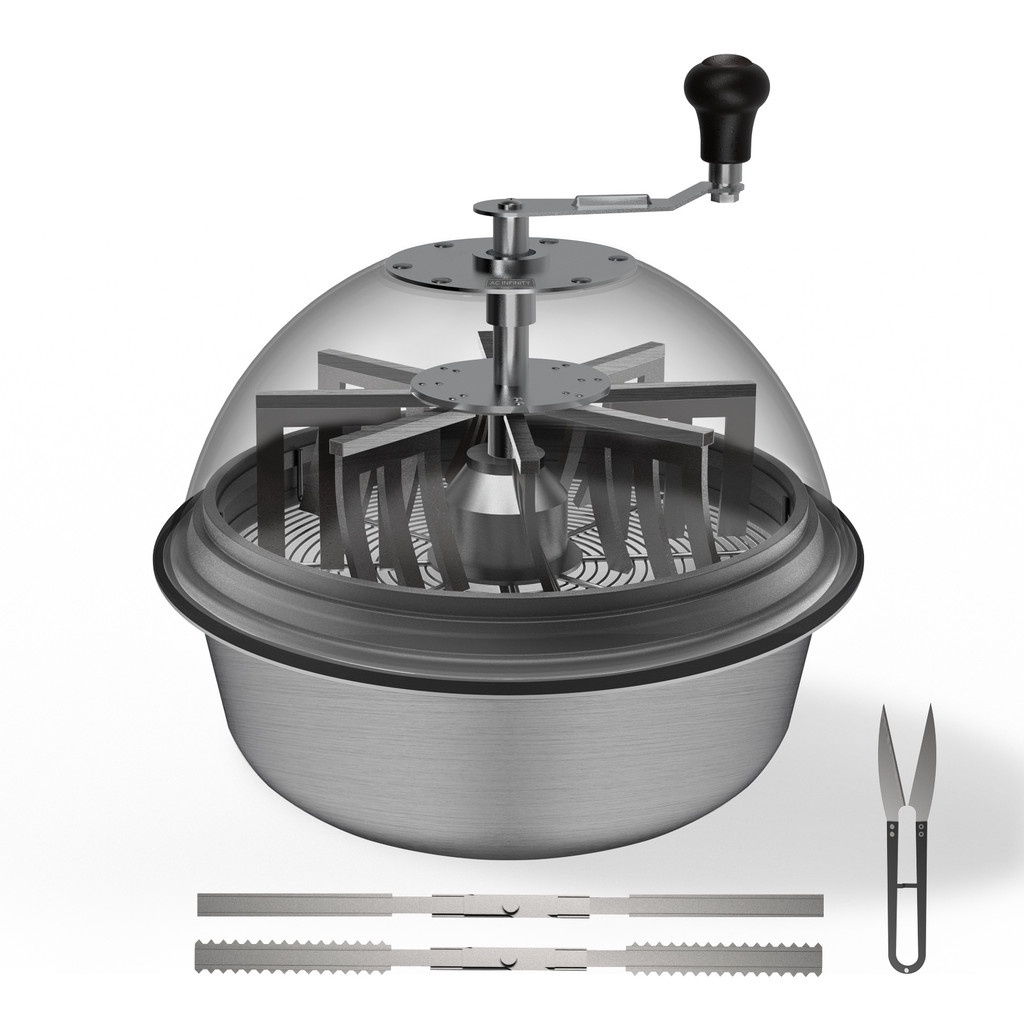 A manual operation processing machine designed to produce finely trimmed plant material such as herbs, buds, and flowers. This bowl trimmer is built with a removable hand crank that turns the sweeper curtains to quickly process high volumes of buds. Interchangeable straight-edge and serrated blades are included to perform wet and dry trimming, respectively. The leaf trimmer bowl has a non-stick surface and collects the trim from your plants to facilitate your processing. This non-stick and stainless steel construction makes the bowl and the blades easy to clean, with the curtain’s food-grade silicone make-up also easy to clean.
