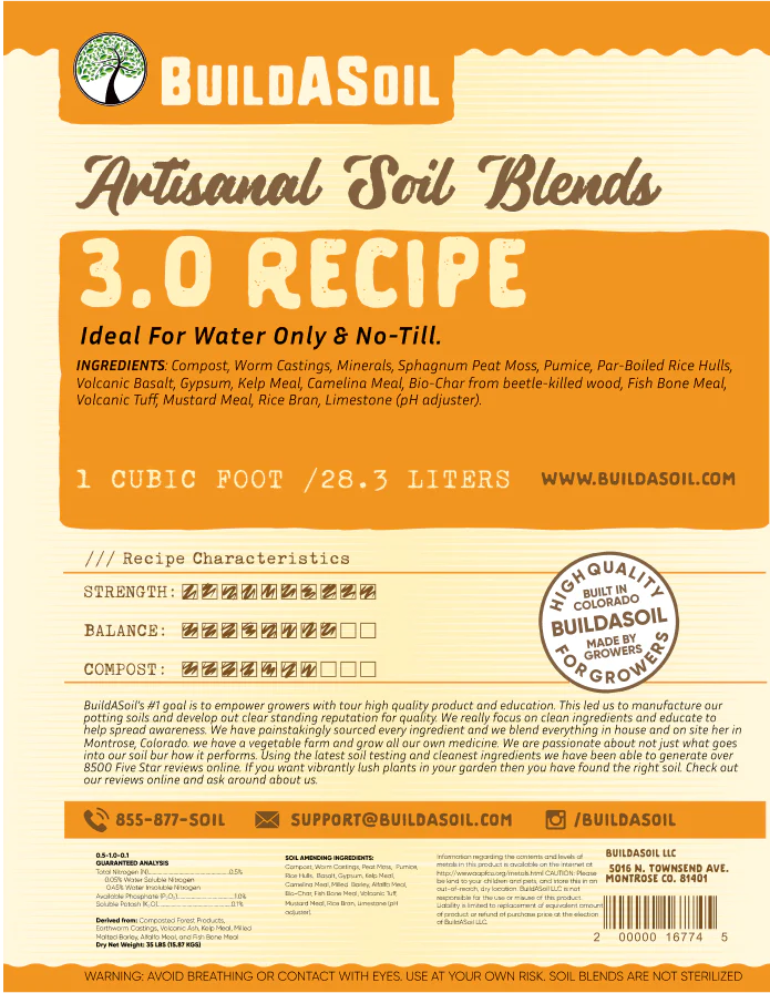 BuildASoil made this amended soil recipe with the Water Only grower in mind. Based on Logan Labs soil testing we designed a soil with more everything. This 3.0 Recipe is one of our richest soils and is still be balanced enough for most all plants. The goal was a compost based soil without any dirty ingredients that would last longer and push harder. If you are used to Super Soil this will perform as you would expect. This potting soil mix has been the favorite for customers that want everything already in the soil when they open the bag. Compared to our other potting soil recipes this is our most loaded up potting mix. Excellent for flowering and full term growth.