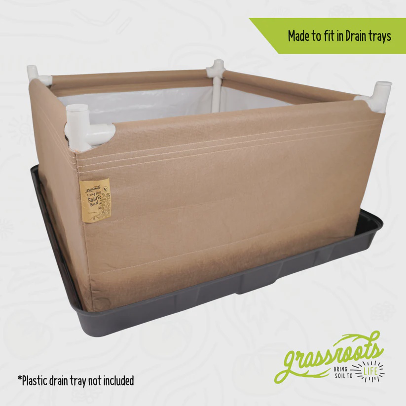 Grassroots Living Soil Fabric Beds combine the benefits of fabric beds with innovative features to optimize plant growth. Easier to assemble, more affordable, and resistant to rot or pests compared to wooden beds, they include a waterproof liner to help maintain moisture levels and build soil biology, bottom aeration strip for air pruning, improved drainage, aeration, and soil health. Reinforced with one-inch schedule 40 PVC pipe for added durability.