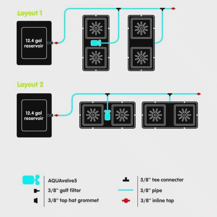 The easy2grow System is easily extended so many pots can be linked to a single reservoir. Please see examples of typical layouts using 3/8″ pipe or 1/2″ pipe in the image gallery. The pots & trays can be easily moved at will, if the plants grow too large they can be spaced further apart with ease. Once set up and a reservoir is filled with water & mineral liquid feed this extremely versatile system will completely take care of all your plant’s needs.