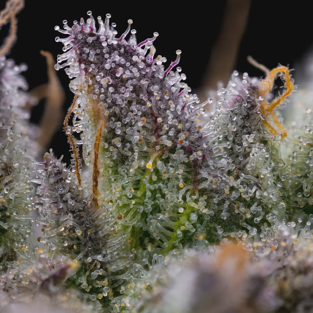 The flowers exhibit pronounced density with advanced trichome development across all surfaces. Mature buds display deep coloration within the calyxes, while the extensive resin coverage indicates exceptional secondary metabolite production. The compact structure demonstrates ideal calyx-to-leaf ratios with minimal sugar leaf presence.