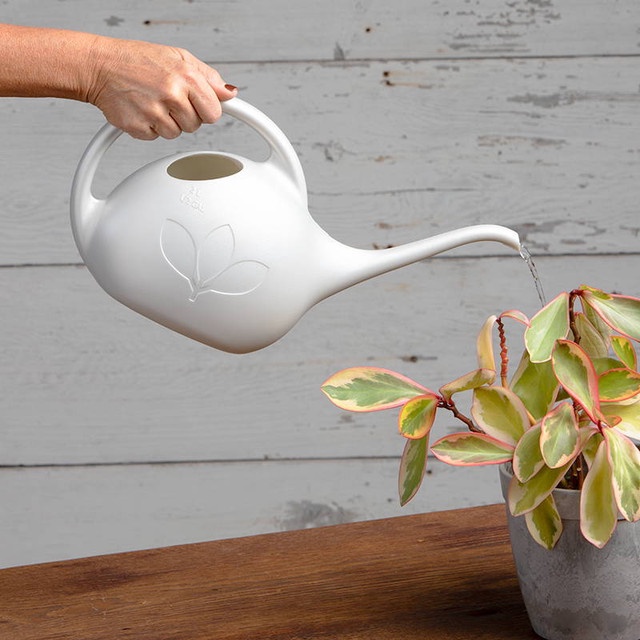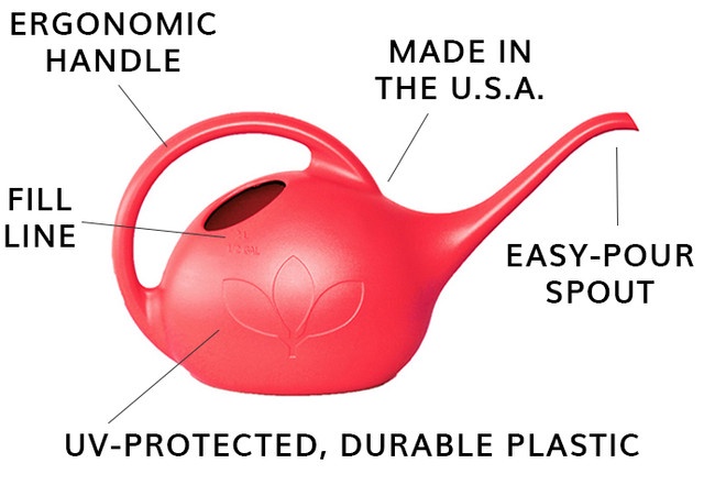The Half-Gallon Indoor Watering Can is creatively designed and constructed with thick-walled, impact resistant plastic. The innovative, curved, loop handle is designed to make it easier to pour water comfortably as the water level goes down. As you water your plants, the water drains perfectly as your hand moves from the front of the handle to the back. The long-stem spout allows you to control the water flow to your plants and makes it easier to water those hard-to-reach places. The can is made with UV-protected, durable plastic and is sure to last for many years. Complete with a timeless, embossed flower pattern and sleek sheen finish – the half-gallon watering can is proudly made in the USA and is a delightful gardening accessory to any gardening enthusiast.