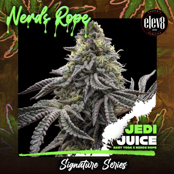 Jedi Juice’s incredible lineage of Baby Yoda x Nerds Rope results in a hybrid that is both visually stunning and highly potent. This strain produces massive yields of frosty buds that shimmer with a forest-green glow and deep purple accents. Whether you’re a seasoned grower or a first-timer, Jedi Juice will leave an unforgettable impression.