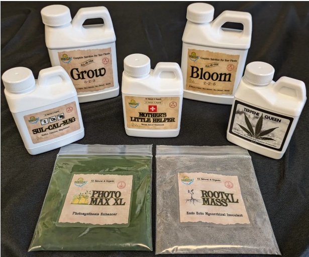 The O.G. Starter Kit includes: 8oz. Grow, 8oz. Bloom, 4oz. Sul-Cal-Mag, 4oz. Mother’s Little Helper, 4oz. Terpene Queen, 1oz. Photo Max XL, 1oz. Root Mass XL.