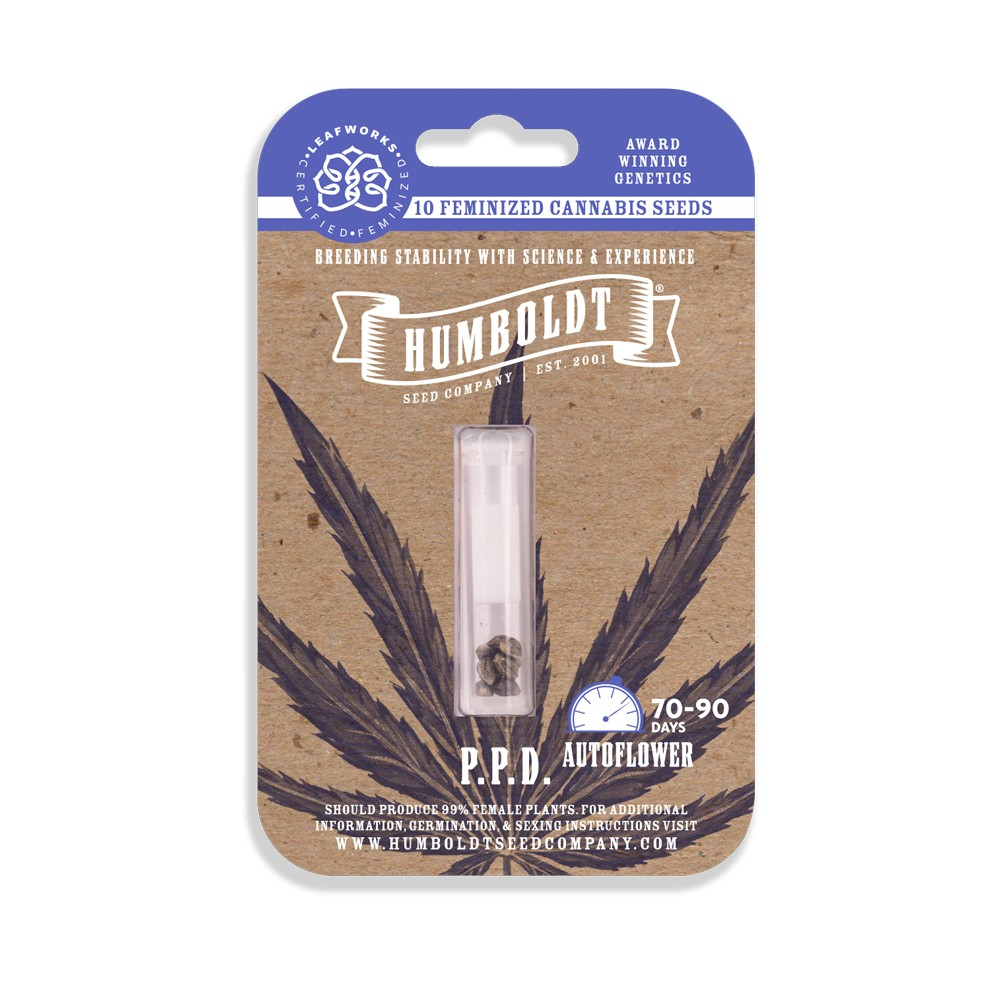 P.P.D (formerly known as Purple Panty Dropper) is Humboldt Seed Company’s original strain. These seeds produce big plants with uniform growth and great yields. These purple buds are moderately dense, with a sweet, floral, almost concord grape-like scent and aphrodisiac smoke. Of course, panties must be dropped consensually.