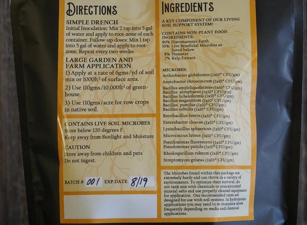 Initial Inoculation: Mix 2 Tsp into 5 Gal of water and apply to root-zone of each container. Follow up doses: Mix 1 Tsp into 5 Gal of water and apply to root-zone. Repeat every 2 weeks.
