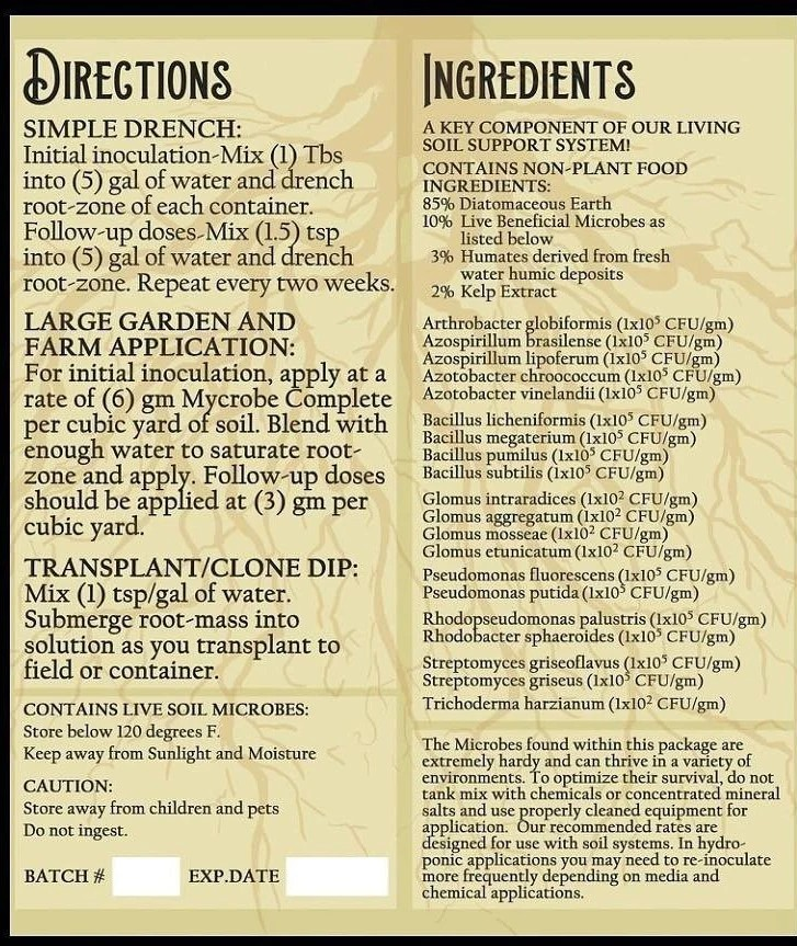 ROOTWISE MYCROBE COMPLETE is “A diverse inoculum of Beneficial Microbes and Mycorrhizae which establish soil-to-root relationships that may assist nutrient uptake, pathogen resistance, and overall plant vigor.”