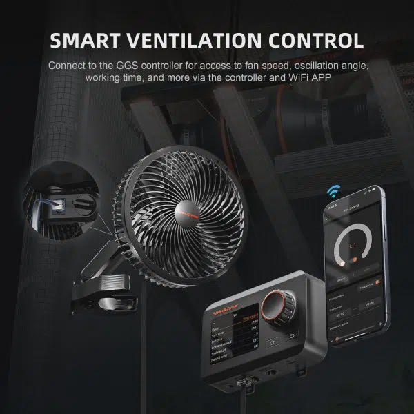 The clip fan links to the GGS Power Strip AC5/AC10 and GGS Controller via an RJ12 cable, enabling remote control through Bluetooth or the Spider Farmer APP. Seamlessly connect to the Spider Farmer GGS Series for smart control over fan speed, oscillation angle, and working time.