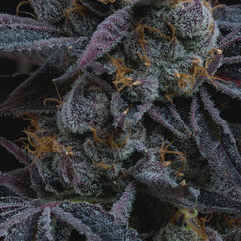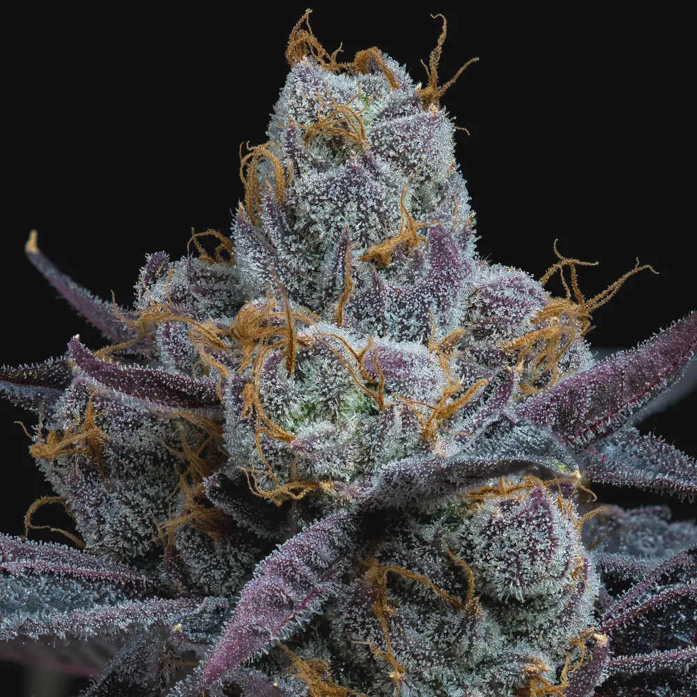 The mature flowers exhibit pronounced density with exceptional trichome development across all surfaces. Compact bud formations display distinctive color variations, incorporating purple pigmentation alongside traditional chlorophyll expression. Comprehensive resin coverage indicates advanced secondary metabolite production, reflecting the variety’s high-potency characteristics.